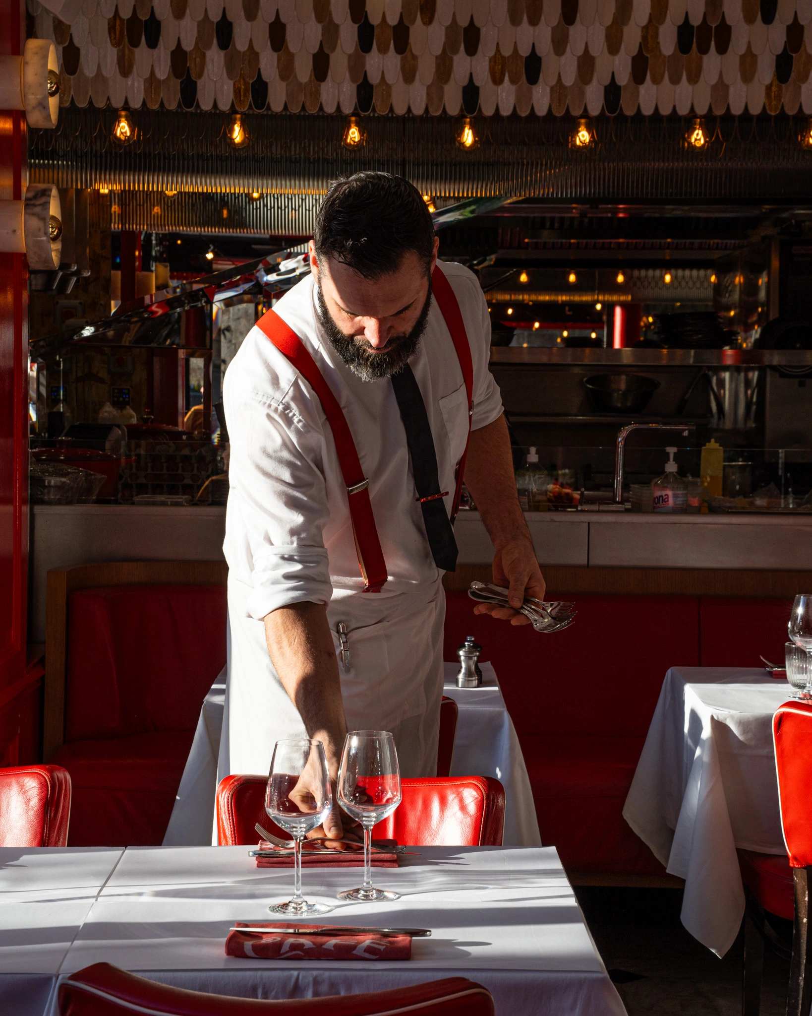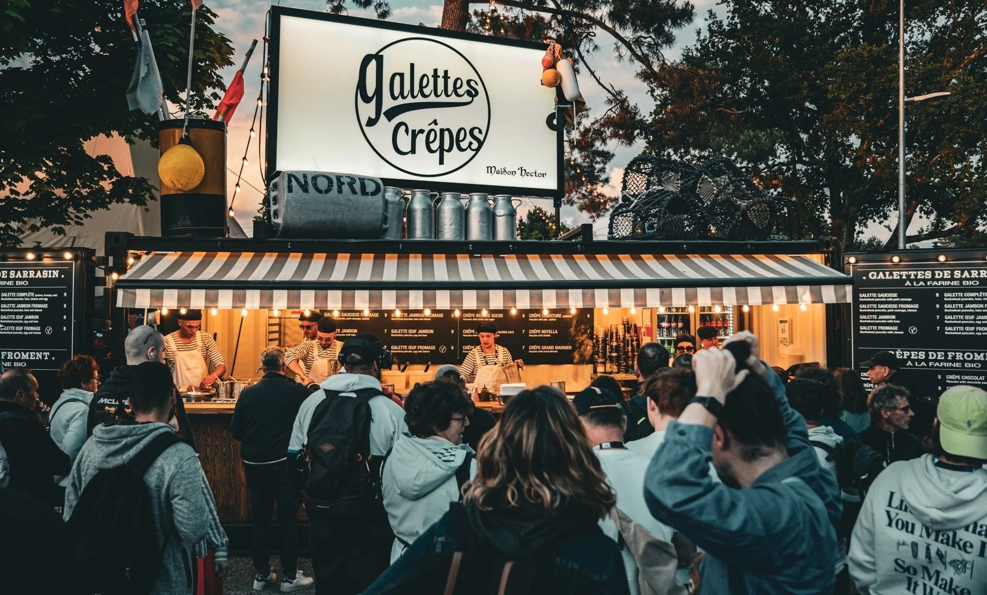 Une brigade élégante vêtue d’une combinaison codifiée vous invite à prendre place sur les grandes tables en bois massif. Le service est continu et sans fin. Les happenings s’enchaînent à partir de 18h, les scènes accueillent des concerts live. De l’assiette à l’expression artistique en passant par le décor, l’expérience est immersive et globale.